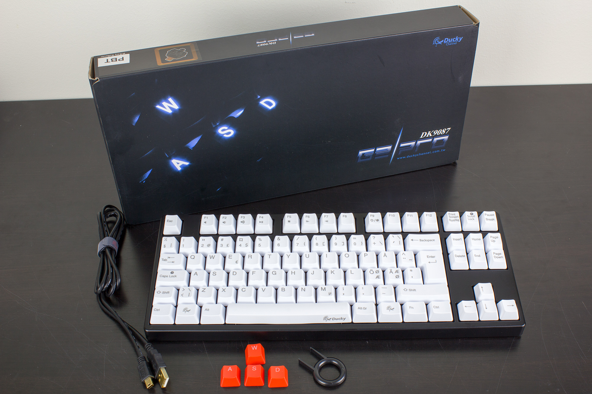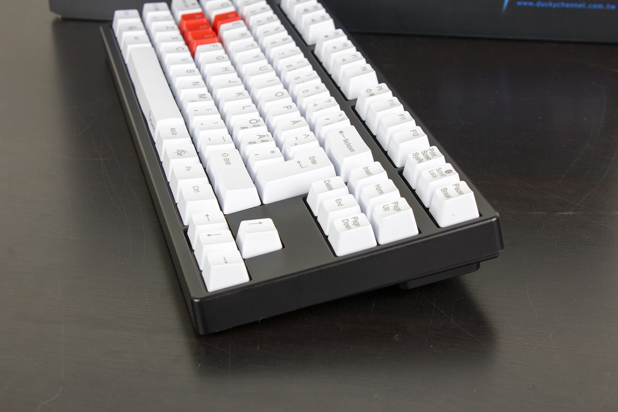 Ducky G2PRO Tenkeyless är en utstickande modell i den här recensionen. Avsaknaden av siffersats gör det till det minsta tangentbordet, och de vita tangenterna gör det onekligen till det högst kontrasterade utseendemässigt. Sin enkla design till trots marknadsförs det som ett speltangentbord, och precis som Shine2 så finns det med flertalet olika brytare, varav exemplaret som granskas här använder sig av MX Brown, en taktil brytare utan det klickande ljudet hos MX Blue.