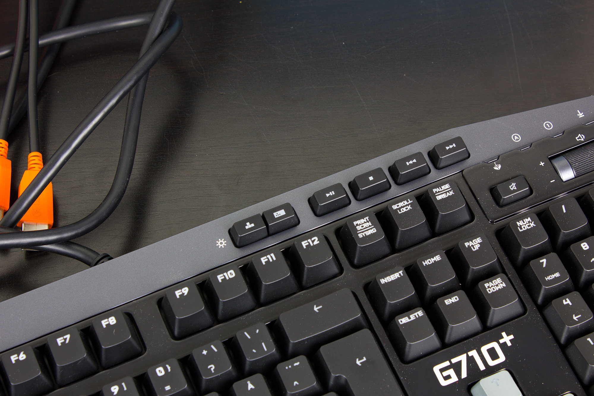 Alla tangenter på G710+ är bakgrundsbelysta, och det inkluderar såväl mediatangenter som makrotangenter (som förövrigt är tydligt omringade av orange plas). Istället för att använda sig av en extra kreativ lösning för att reglera ljuset, som Gigabyte på sitt Osmium, eller allehanda olika belysningslägen som exempelvis modellerna från Ducky och Cooler Master, så har Logitech valt att lägga in två separata kluster av bakgrundsbelysning. En av knapparna för att reglera belysningen reglerar WASD-tangenterna och piltangenterna, medan den andra helt enkelt reglerar alla andra tangenter. På så sätt kan man välja om man vill ha belysning på enbart WASD och piltangenter, belysning på alla utom dessa, eller ha lite belysning på alla tangenter utom WASD och piltangenterna, på vilka man kanske vill ha lite starkare sådan.