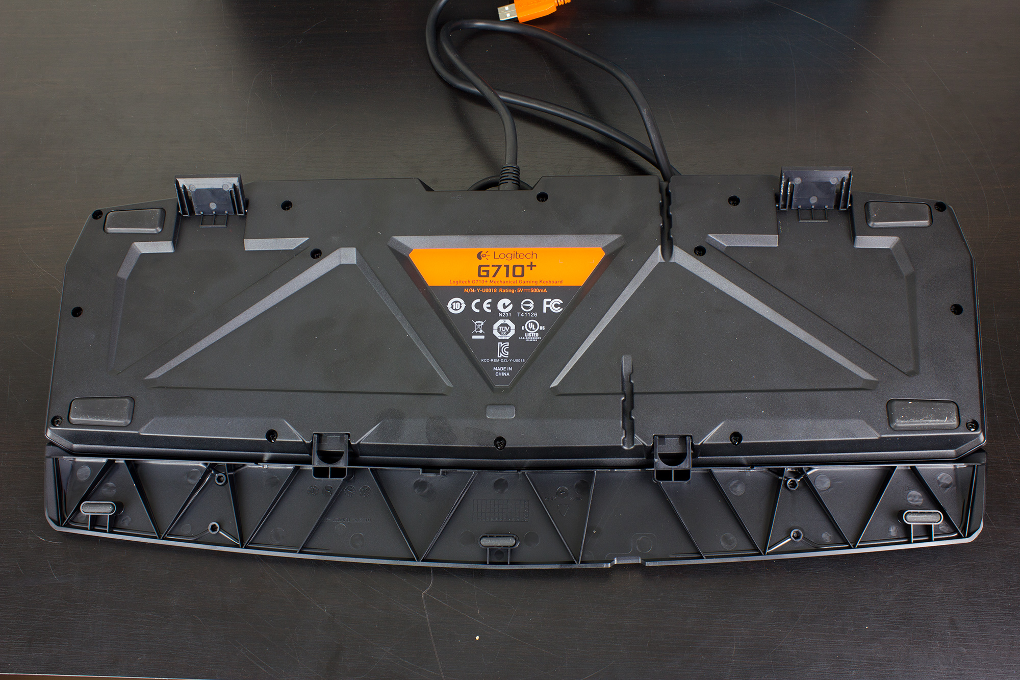 På baksidan huserar fyra ganska stora gummifötter direkt under tangentbordet, och ytterligare tre på handlovsstödet. Dessa ger dock ett medelmåttigt fäste, detta trots att de är ungefär i samma storlek som de på undersidan av Steelseries 6Gv2. Det finns heller inget gummifäste på de utfällbara benen, så fästet blir ytterligare något sämre när dessa används.