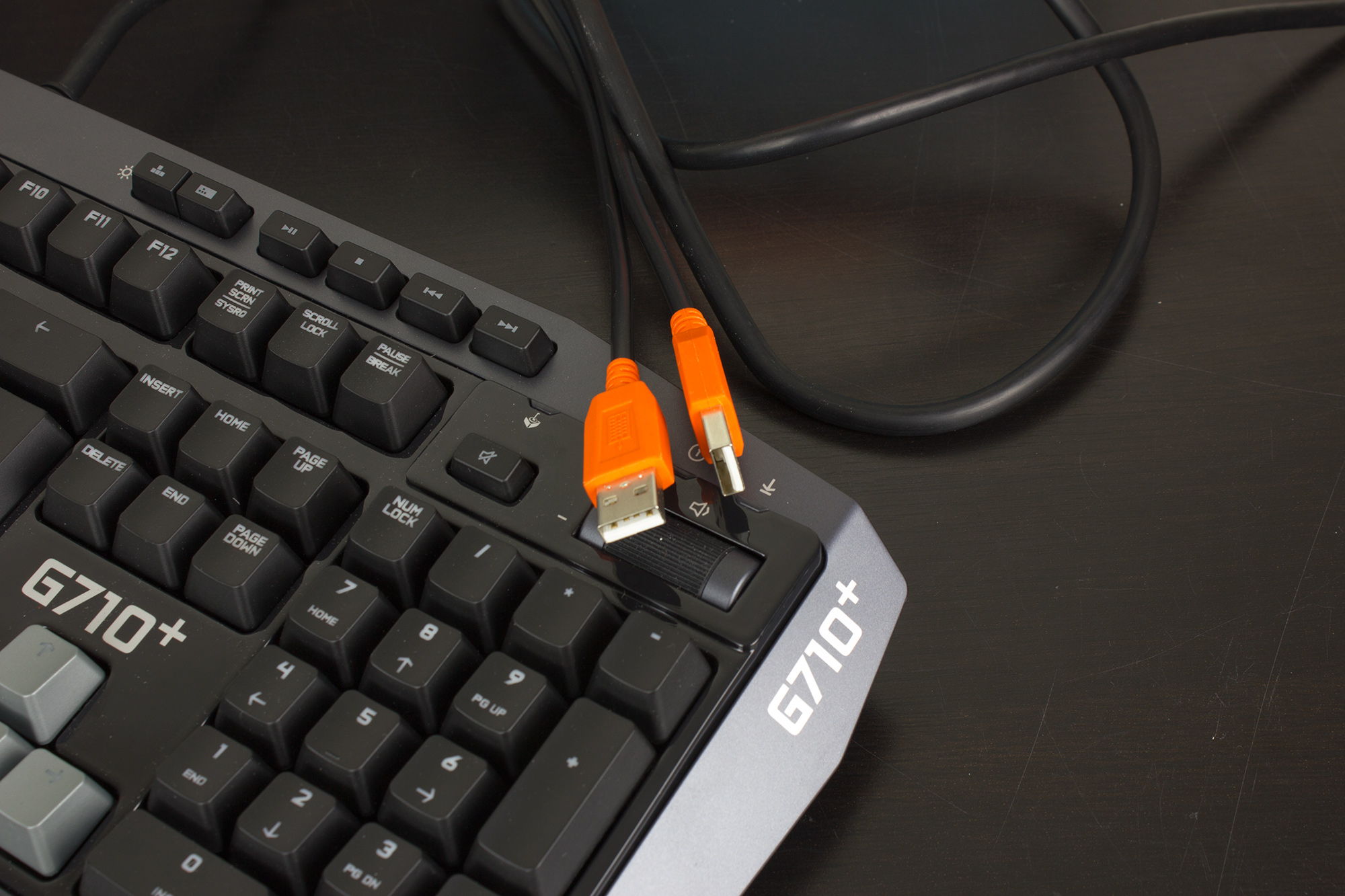 Tangentbordet ansluts med två USB 2.0-kontakter, varav den ena för själva tangentbordet och dess funktioner, och den andra för USB-passthrough. Det finns ingen funktionalitet för passthrough av ljud. Kabeln är inte heller utbytbar, och är ganska tjock och otymplig, med en stor orange plastklump där den delar upp sig i de två delkontakterna.