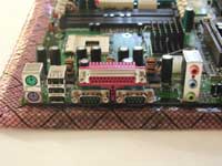 ABIT har avvikt från den “vanliga” I/O-layouten på baksidan av kortet. Istället för att använda 2 eller fyra USB-portar har man valt att använda 3st externa USB-portar. Eftersom moderkortet har integrerat ljudkort så finns självklart in och utgångar för dessa funktioner på I/O-platten. Men spelkontrolls porten har man flyttat så att kontakten sitter längst ner på moderkortet och leds därifrån ut till en PCI plats genom en kabel. För de som inte använder spelporten gör det inte så mycket men för de som verkligen har nytta av den kan placeringen vara lite obekväm.