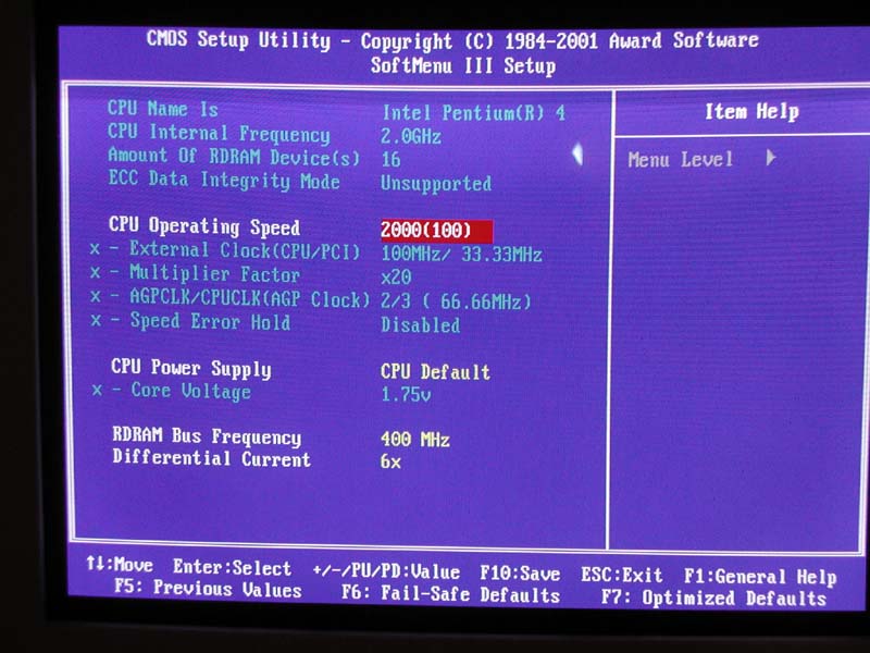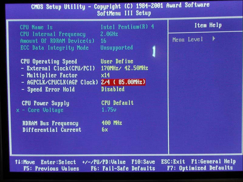 I Soft meny III kan du även ändra spänningen till processorn (vcore), AGP/CPU klock (2/3, 2/4, Fix) och välja vilken RDRAM bussfrekvens (300/400Mhz) man vill använda.