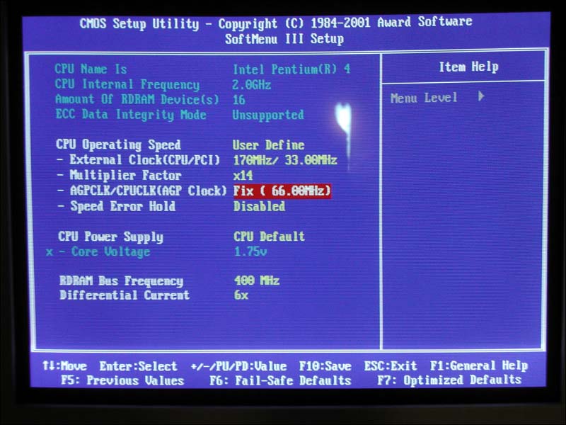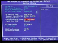 En mycket intressant detalj i Soft Meny III som vi tidigare nämnde är “Fix” inställningen för AGP bussen. I vanliga fall kan du bara välja en delningsfaktor som t.ex 2/3 eller 2/4. Delningsfaktorerna används på processorbussen och ger då rätt bussfrekvens till AGP enheten. Om vi t.ex använder oss av en 133Mhz FSB så är 2/4 på AGP bussen det bästa då det ger 66Mhz vilket är original hastigheten över AGP bussen.