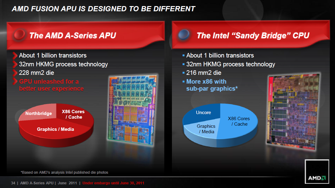 AMD förnekar inte att man använder en föråldrad arkitektur i Llano men menar på att deras design är mer balanserad än Sandy Bridge. AMD:s grafikkrets tar upp straxt över 40% av kretsytan medan processor plus cache-minne tar upp ungefär en lika stor del av kakan som nordbryggan. Förutom att försöka ändra på datorindustrin genom att överlåta fler beräkningar på GPU:n, så tar AMD sitt första steg för att försöka skilja sig från Intel och vandra i dess skugga på x86-marknaden. Detta genom att släppa en design med ett fokus som inte ligger på just x86. AMD menar på att de erbjuder en mycket högre visuell upplevelse och högre spelprestanda än vad Intel kan till samma pris och strömförbrukning med Llano något som blir upp till bevis längre fram i artikeln.