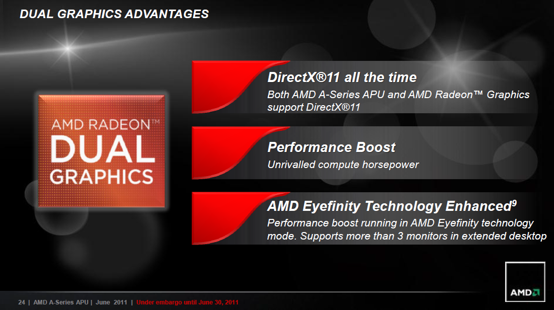 Den sista funktion vi ska prata om som kommer med Llano och Lynx-platformen går under beteckningen Dual-Graphics. Dual-Graphics bygger på ett gammalt koncept från AMD som kallades Hybrid CrossFireX där man kunde kombinera ett grafikkort med en integrerad grafikkrets för högre prestanda med AMD:s CrossFire-teknik. Tekniken tog aldrig riktigt fart och fick en mycket kort livslängd på marknaden på grund av undermålig prestanda, dåliga drivrutiner och dåligt stöd från Microsoft som inte ville stödja dynamisk växling mellan Hybrid CrossFireX och att sätta det diskreta grafikkortet i viloläge.