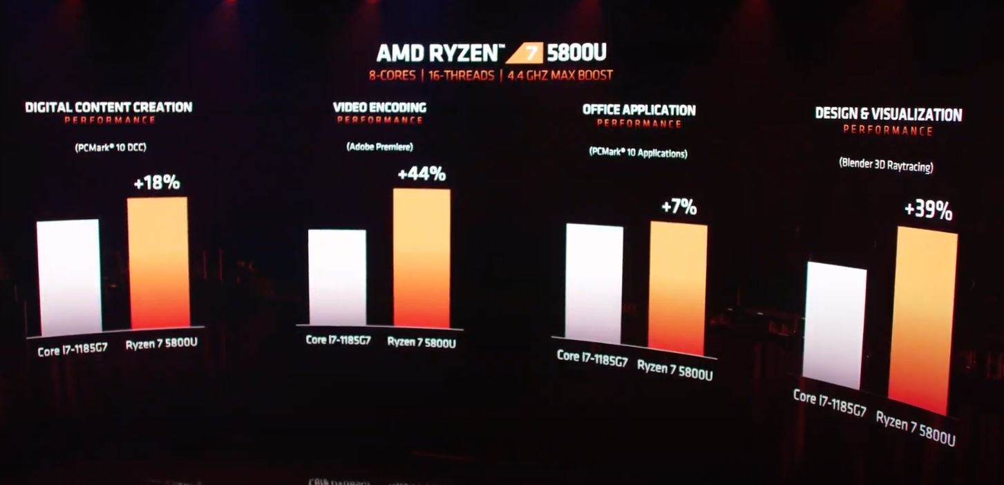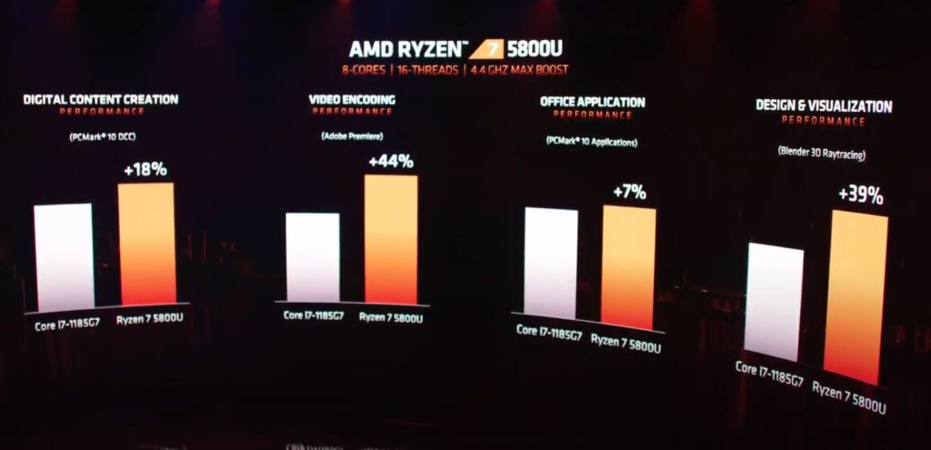 Ryzen 7 5800U ska enligt AMD vara den mest kraftfulla processormodellen tillgänglig för ultratunna bärbara datorer. Mycket fokus lades på just batteritid för denna enhet under AMD:s presentation. Här menar AMD att användare kan förvänta sig 21 timmar videouppspelning eller 17,5 timmar generell användning på en full laddning. Sett till specifikationer erbjuder denna processor åtta kärnor med 16 trådar och en maximal turbofrekvens på 4,4 GHz.