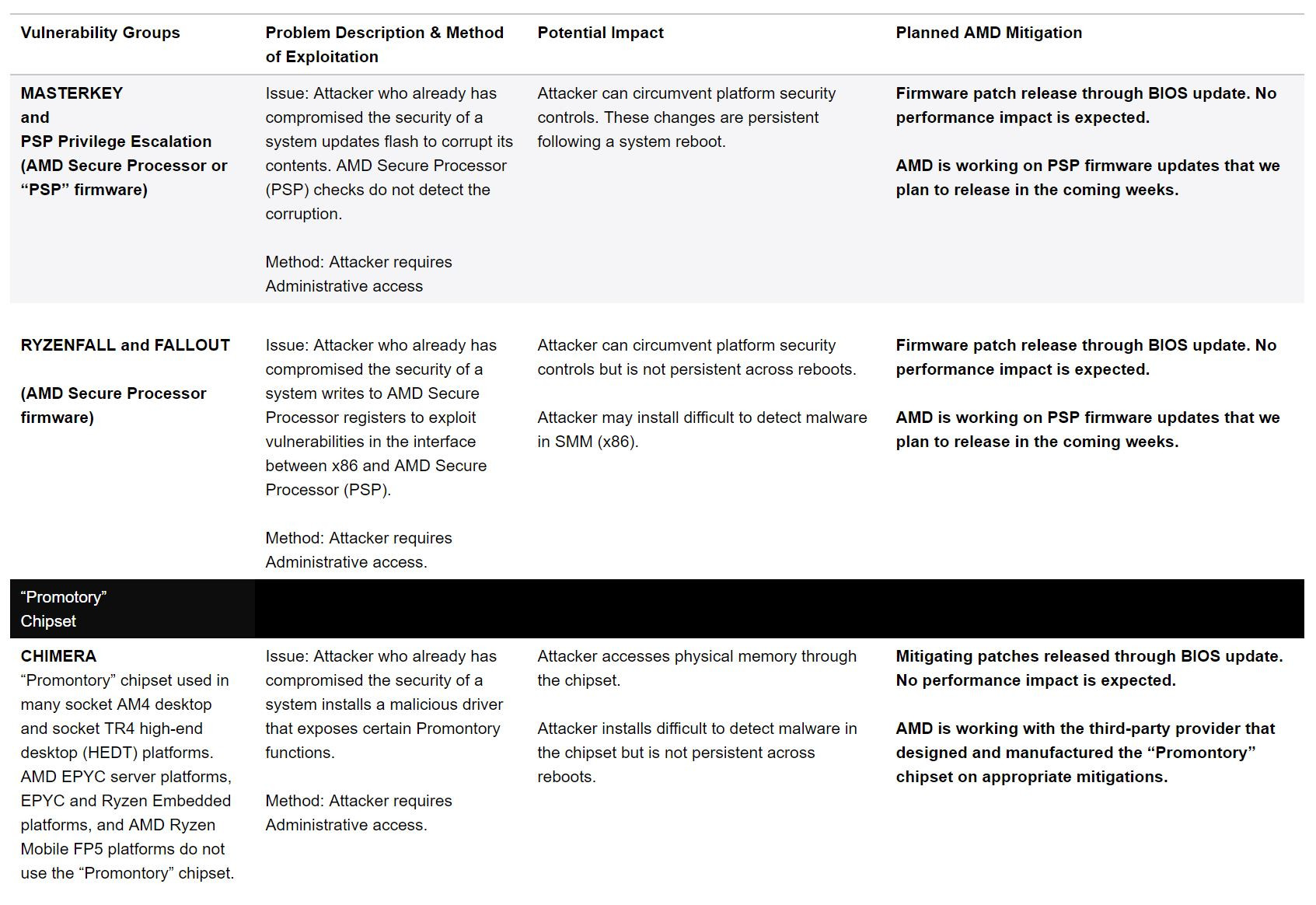 I CTS Labs rapport handlar det om fyra klasser av säkerhetshål, dessa går under namnen Masterkey, Ryzenfall, Fallout samt Chimera. AMD har i sin tur grupperat ihop dessa i tre kategorier och i det ovannämnda blogginlägget delade man med sig av en bild som snabbt förklarar de olika säkerhetshålen samt vad för AMD planerar att göra åt dessa.
