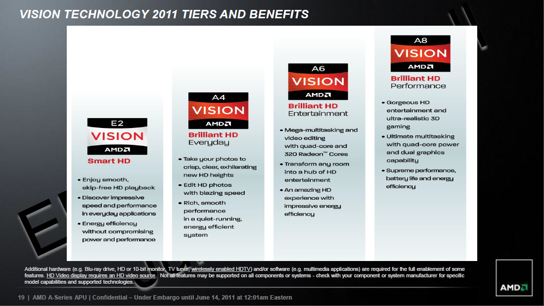 Nästa delmoment förklarar hur de olika modellerna flyter ihop med AMD:s nya VISION-märkning vilket blir grafiken och antalet kärnor. A4- kommer med 2 kärnor och 240 Radeon-kärnor på 444 MHz, A6- kommer med 4 kärnor och 320 Radeon-kärnor på 400 MHz och till slut A8- med 4 kärnor och 400 Radeon-kärnor på 444 MHz. Alla modeller på 35W kommer med suffixet M, medan de på 45W kommer med två bokstäver MX. Hur AMD har tänkt ser ni i presentationsbilden nedan.