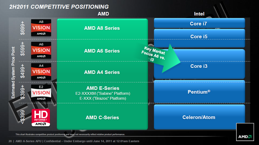 Det mest intressanta är nog prissättningen men med tanke på att det är bärbara datorer det handlar om idag hade det inte hjälpt så mycket att lista priserna för varje enskild modell. Även här ser vi återigen hur AMD placerar sina APU:er mot Intels processorer, där man anser att man inte bara kan konkurrera med en stark CPU utan även med en GPU.