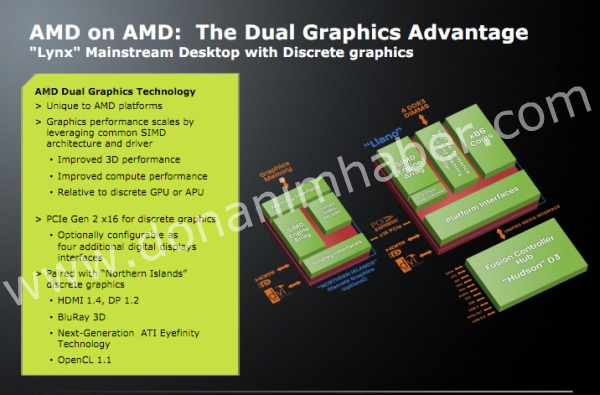 In a product presentation that was published at Donanimhaber AMD calls its technology for Dual Graphics Technology. The technology enables AMD’s Lynx platform to connect the integrated graphics circuit with a discrete graphics card from the Radeon HD 6000 series. This way you will only improve performance through a form of Hybrid CrossFire but also make use of up to four extra digital outputs.