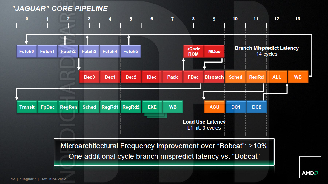 Jaguars Pipeline är ett steg längre än Bobcat vilket ger ett marginellt försämrat IPC-värde, men det vägs upp av de andra optimeringarna i arkitekturen. Fördelen är att AMD räknar med en klockfrekvens som blir minst 10 procent högre än den Bobcat är kapabel till. Latenserna för cacheminnet ligger kvar på samma nivå som tidigare, vilket är 3 klockcykler för L1-cacheminnet och 17-clockcykler för L2-cacheminnet.