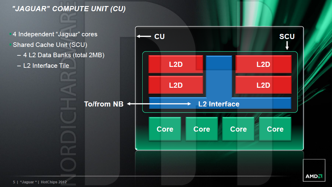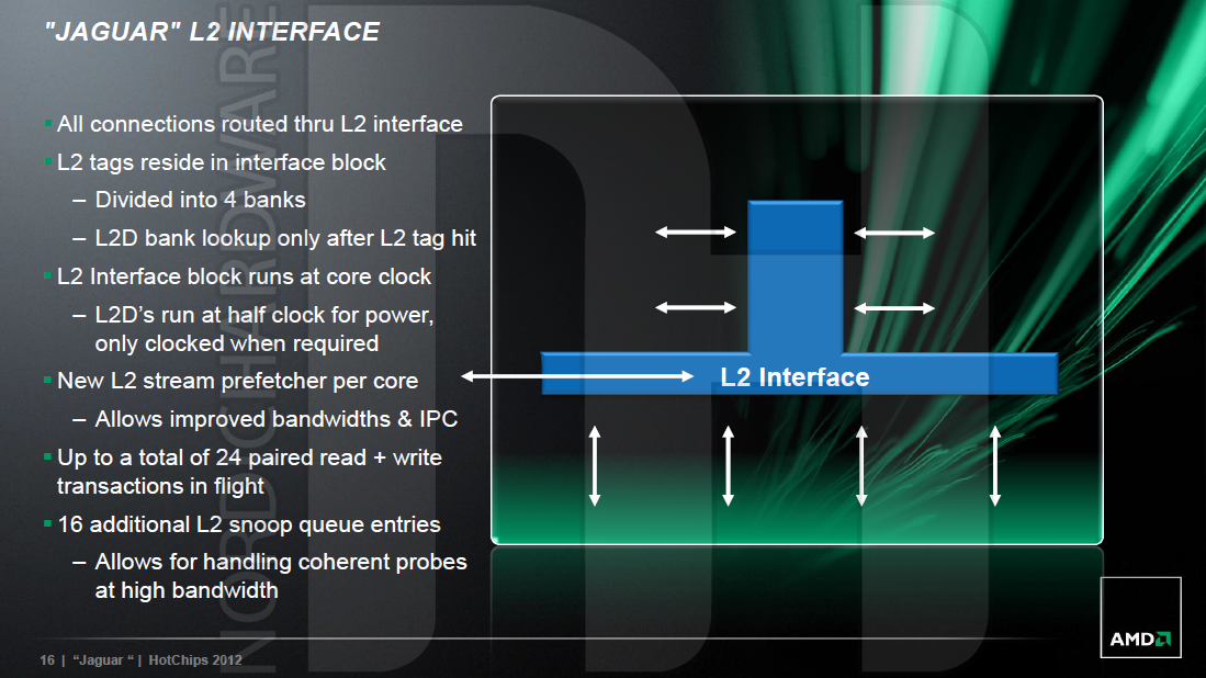 Förutom en flyttalsenhet som gått upp i vikt så är den stora nyheten det nya L2-cacheminnet. Jaguar är designad för att vara en fyrkärnig arkitektur där varje kärna har fått 512 kilobyte L2-cacheminne vilket är förhållandevis lite, men en nödvändig kompromiss för att inte överskrida strömbudgeten men även att begränsa kretsytan som processorkärnorna kommer ta upp. L2-cacheminnet förblir även 16-vägs associativ likt Bobcat. Det finns ett stort men – en ny bussenhet binder samman cacheminnet så att det delas mellan alla processorkärnor.