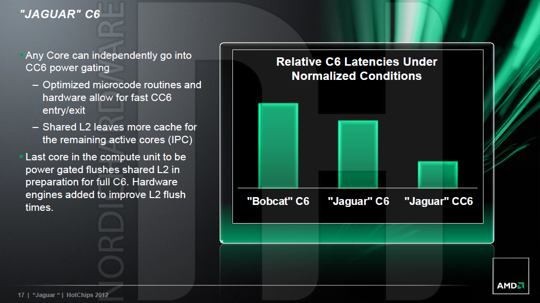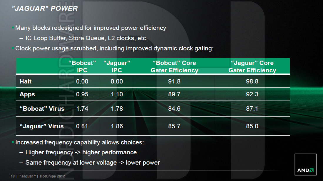 I Bobcat-arkitekturen kunde 91,8 procent av kärnan stängas av helt, men det här innebar att 8,2 procent fortfarande låg och drog ström i onödan. Med Jaguar ligger siffran på det klart bättre 98,8 procent vilket betyder att endast 1,2 procent drar och läcker ström. Även när applikationer körs så klarar Jaguar av att stänga av en större del av processorkärnan än vad Bobcat-arkitekturen klarade av.