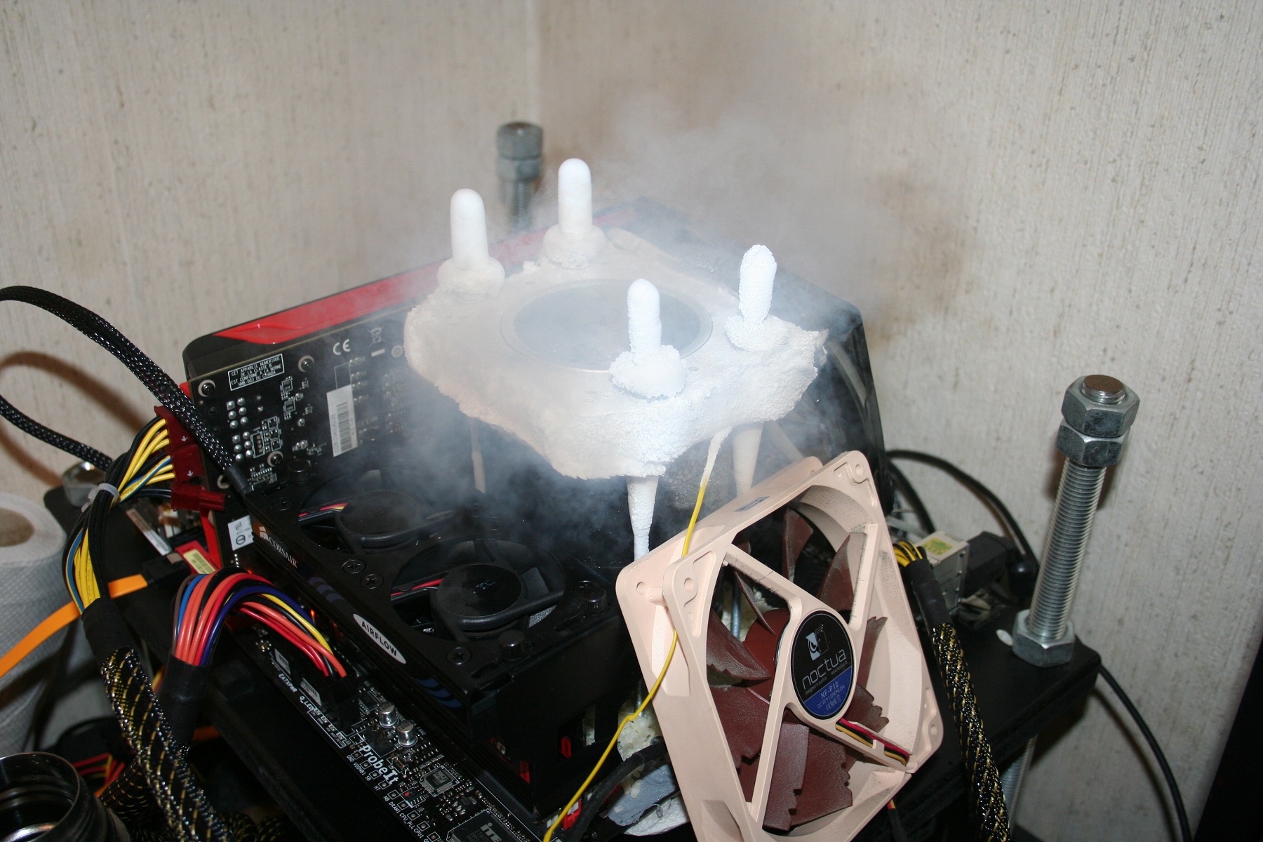 För att ta reda på ungefär vad processorn klarar av med belastning på samtliga kärnor bestämde vi oss för att sparka igång wPrime, med SF3D Inflection Point-potten fylld med flytande kväve och temperaturer på runt -185c. Isoleringen bestod av knådgummi (Faber-Castell art eraser) och Uncle Ben’s snabbris, då denna benchsession sammanföll med en annan session där jag testade det med hyfsat resultat. Processorn hade inga som helst bekymmer med att starta i 6GHz på första försöket med 1.87V, härifrån skulle saker bara förbättras.