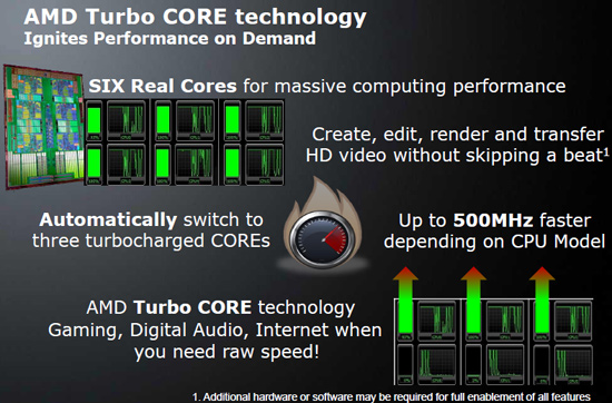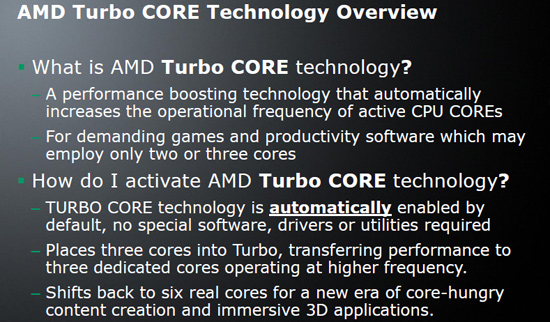 Själva Turbo CORE tekniken är förutom de två extra kärnorna den stora nyheten i Phenom II X6-serien. Tanken AMD har med deras Turbo CORE teknik är att helt enkelt maximera prestandan i sina processorer inom den givna strömförbrukning man specificerar sina kretsar för, oavsett applikation.
