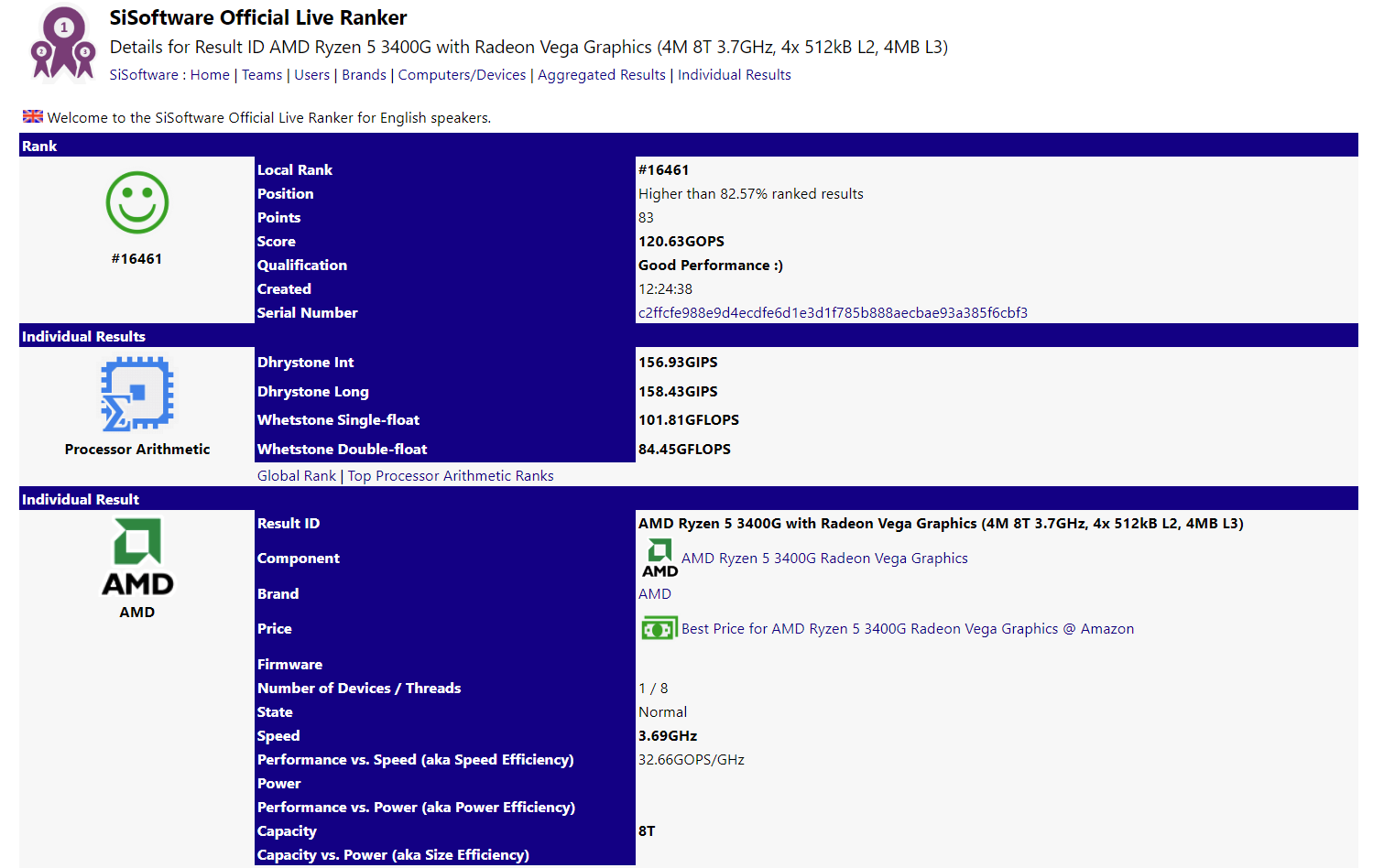 Apisak backar även upp sina påståenden med en länk till Sisoftwares databas där Ryzen 5 3400G har listats. Här listas klockfrekvensen mycket väl som 3,7 GHz för modellen. Däremot listar databasen inte några turbofrekvenser. Det framgår dock att modellen kommer utrustad med fyra processorkärnor och åtta trådar tillsammans med två megabyte (MB) L2 cache och fyra MB L3 cache. Några klockfrekvenser för de kommande Picasso-enheternas grafikkretsar nämns varken av Tum Apisak eller Sisoftwares databas.