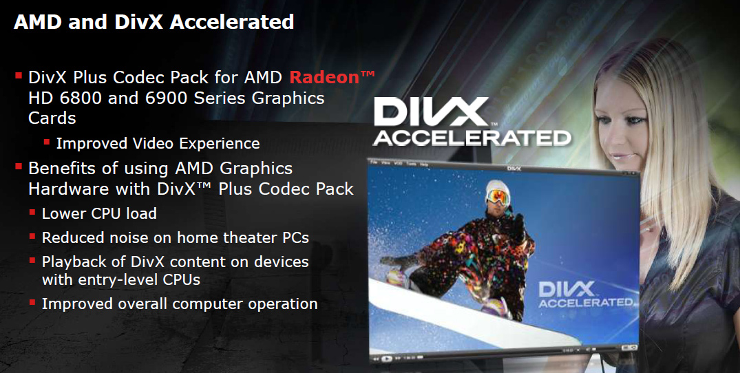 AMD släppte med sin nya Radeon HD 6800-serie sin tredje generations videoprocessor, UVD3. Med Catalyst 2011 har man ytterligare satsat på videouppspelning och denna gång i samrbete med DivX. Ett speciellt DivX Plus codecpaket för Radeon HD 6800 och Radeon HD 6900-serierna ska ge stöd för hårdvaruaccelererad uppspelning av DivX-klipp. Detta ska avlasta systemets processor vilket i sin tur drar ner strömförbrukning och värmeutveckling.Med den nya catalystsviten kommer även ett brett stöd för OpenGL 4.1 där vi bland annat hittar full kompabilitet med OpenGL ES 2.0 API:er.