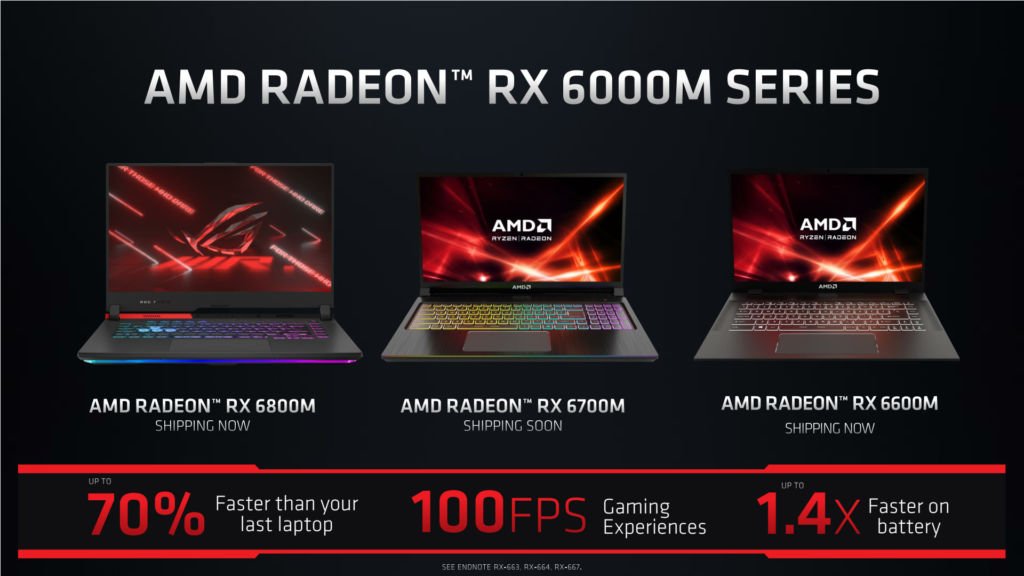AMD Radeon RX 6000M tar RDNA 2 till bärbara datorer. I serien finns tre modeller kallad Radeon RX 6600M, 6700M och 6800M som ska ge prestanda för 1080p- och 1440p.