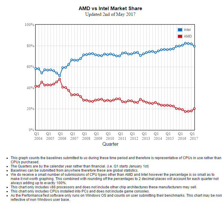 Det är samtidigt siffror som stämmer hyfsat väl med fördelningen på CPU-marknaden där AMD under fjärde kvartalet 2016 stod för 18,1 procent (%) av Passmarks CPU-bidrag. Under första kvartalet 2017 ökade man sin andel med 2,2 procentenheter, en procentuell ökning med 12 % från föregående kvartal. Där 20,1 % av alla bidrag som skickades in kom från AMD-processorer.