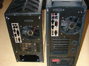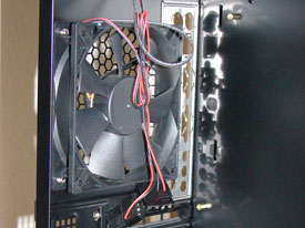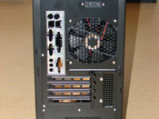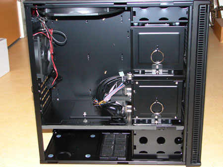 The back looks just like any other Performance One case, just smaller. The power supply goes in the bottom chamber, above that you have the rear 120mm fan and above it, the two controllers for the rear and top fan. No holes for pulling water cooling though, which is a bit understandable though as the case is already crowded as it is, without a water cooling kit inside.