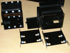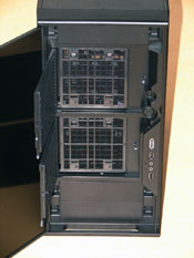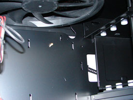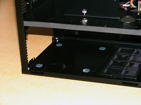 A drawback with this design is that all harddrives are now located in the upper chamber and that the lower chamber somewhat loses its original purpose. The power supply is still separate from the rest, but Mini P180 has no fan for cooling the power supply or the additional 5.25” units. With previous models you’ve been able to split up the harddrives among the two chambers and avoid them warming each other. And if you install two 5.25″ drives in the lower chamber, there will be no air flow for the power supply.