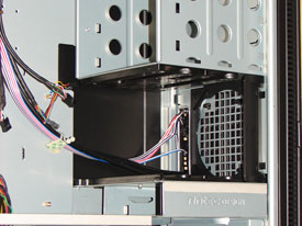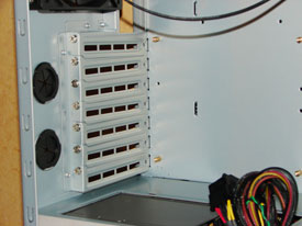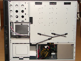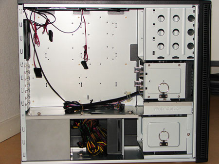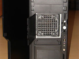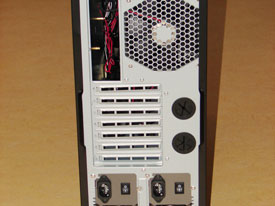 On there rear, things have changed slightly. All of the things we liked about the P182 are still here, but since this one has two power supplies and more fans, it looks a bit different. The power supplies are stacked on their sides so that both can be housed in the lower chamber of the case. This could certainly seem like a possible heat trap, but there is a decent airflow through them and the whole lower chamber, so nothing to worry about really.
