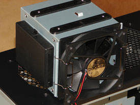 In the upper right picture you can see the upper harddrive cage remove and placed on top the case. We’ve used the brackets that comes with the case to attach a 120 mm fan to the cage. This will create a wind tunnel effect which helps for cooling the graphics card(s).