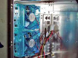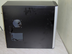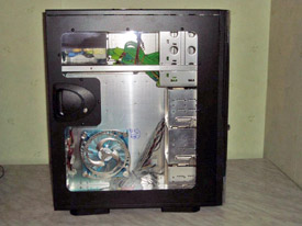 På sidpanelen hittar vi en till fläktplats för en 80*80*25 mm fläkt för att kyla ner komponenterna och framförallt grafikkortet. En väldigt annorlunda anordning i det här chassit är ett rör som är byggt för att ta in luften som ska kyla ner processorn direkt utifrån istället för att använda samma luft som resten av komponenterna. Det finns plats för upp till 92*92*25 mm CPU fläktar att ansluta den till. Röret är självklart inställningsbart för att komma så när CPUn som möjligt. Det kan dock vara lite krångligt att ställa in den rätt så man inte ger extra tryck mot processorn.