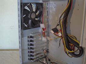Kylningen i den här lådan är långt ifrån optimal vid inköp utan de har mest gjort iordning för att du själv lätt ska kunna installera fler fläktar för att göra kylningen komplett. Baktill har de satt en ordentlig medföljande 120*120*25 mm fläkt med en liten fläktkontroller så du kan ställa in tre olika hastigheter. Vill man nu ha detta chassi till en filserver så lär man säkert vilja att den ska vara tyst men man måste definitivt installera fler fläktar.
