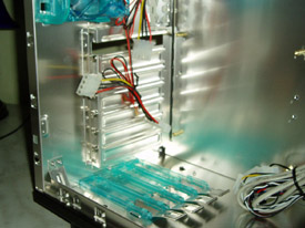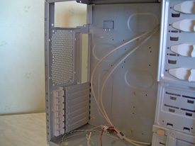 Invändigt så har de valt att använda skruvar till allt förutom 5,25″ platserna men de har åtminstone sett till att använda sig av ordentliga bra hårddiskrack. Medföljande fläktar är det dock riktigt dåligt med då de har valt att bara fylla upp den bakre fläktplatsen men de har istället valt att skicka med en bra fläkt dit. Kylningsmöjligheterna i lådan är ganska bra fast man måste räkna med att investera i lite fläktar, gallret med dammfilter i fronten släpper igenom ordenligt med luft och är inget större hinder för fläktarna. Röret som ger friskluft direkt mot processorkylningen är riktigt fyndig och väldigt funktionabelt.