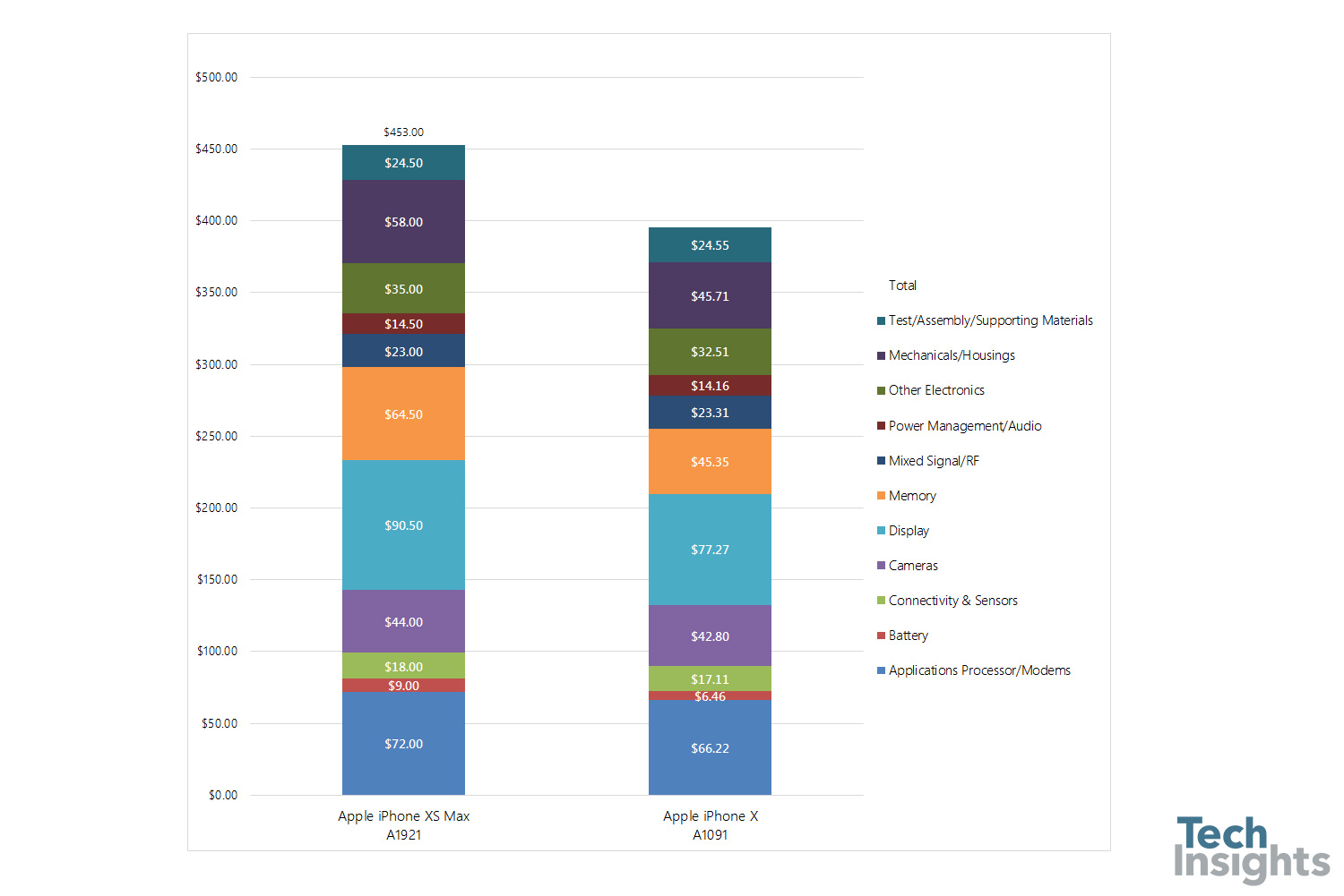 Fjolårets flaggskeppsmodell, Iphone X med 64 GB lagring, kostar omkring 3 500 kronor att tillverka. Den nya modellens ökade lagringskapacitet ökar definitivt produktionskostnaden. Dock är det inte bara den interna lagringen som tvingar Apple att lägga ut en ansenlig summa för varje tillverkade Xs Max. TechInsights menar att telefonens skärm, chassi samt den nya processorn A12 Bionic är de absolut dyraste delarna i den nya telefonen.