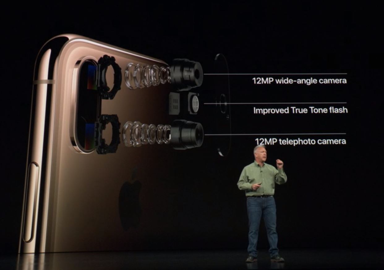 Telefonernas kamera har som väntat också uppgraderats och här har Apple fortsatt att satsa på vad verkar samma dubbla sensorer, alltså inte tre likt konkurrenter som Huawei. Apple menar dock att deras 12 megapixelsensorer där den ena agerar vidvinkel och den andra telefoto ska paras med en ny bildprocessor som möjliggöra foto i “Smart HDR”. Telefonen tar vid fototillfället flera bilder och syr samman dessa för att ge den bästa möjliga bildkvalitén. Liknande funktioner som bland annat Google introducerat med sina telefoner i Pixel-serien. Apple lovar även avancerade bokeh-effekter där användaren själv kan ställa skärpedjupet i bilden efter fotot är taget. Vid inspelning av video ska iPhone Xs nu även spela in stereoljud.