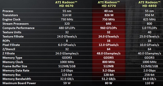 RV740 heter kärnan som alla HD 4770 bygger på och är som synes en nätt liten skapelse. Hur kortet är tänkt att placera sig jämfört med sina bröder i HD 4000-familjen finner ni nedan. Värt att notera är att ASUS EAH4770 Formula följer AMD:s referensfrekvenser, mycket tack vare att AMD själva inte är förtjusta i tanken att deras billigare kort slår sina storebröder på fingrarna. Allting ser med andra ord mycket lovande ut ur pris/prestanda-synpunkt.