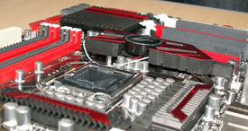 Vi fick även titta närmare på kylningslösningen ASUS utvecklat för sitt P55 moderkort som med en låg profil ska ge gott om utrymme även för de största kylflänsar. Med nordbryggan mer eller mindre integrerad i processorn finns det nu bara en stor krets att kyla, men genom att låta kylflänsarna sträcka sig ner runt CPU-sockeln kan man sprida värmen över en större yta och optimera kylningen av kortets komponenter.