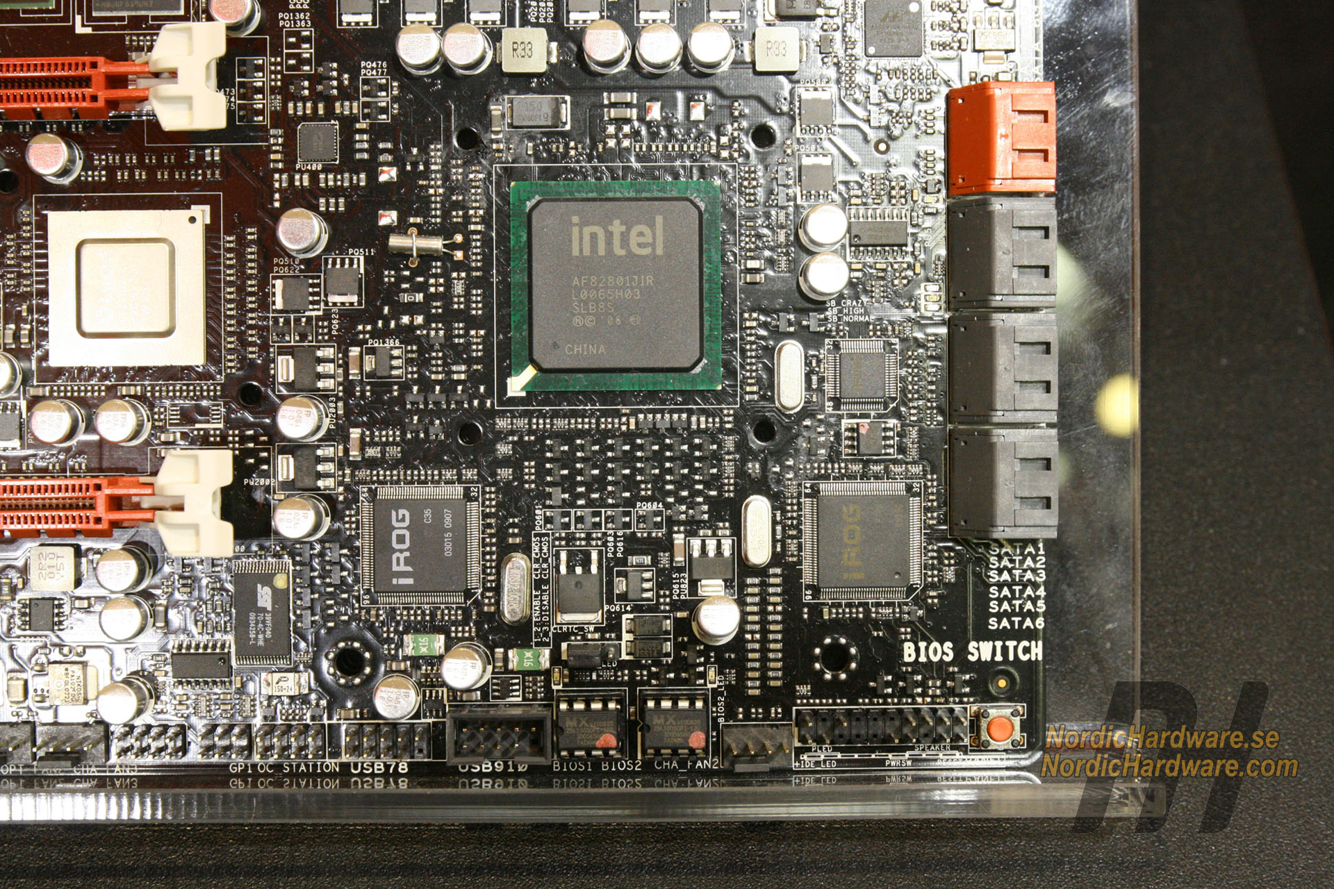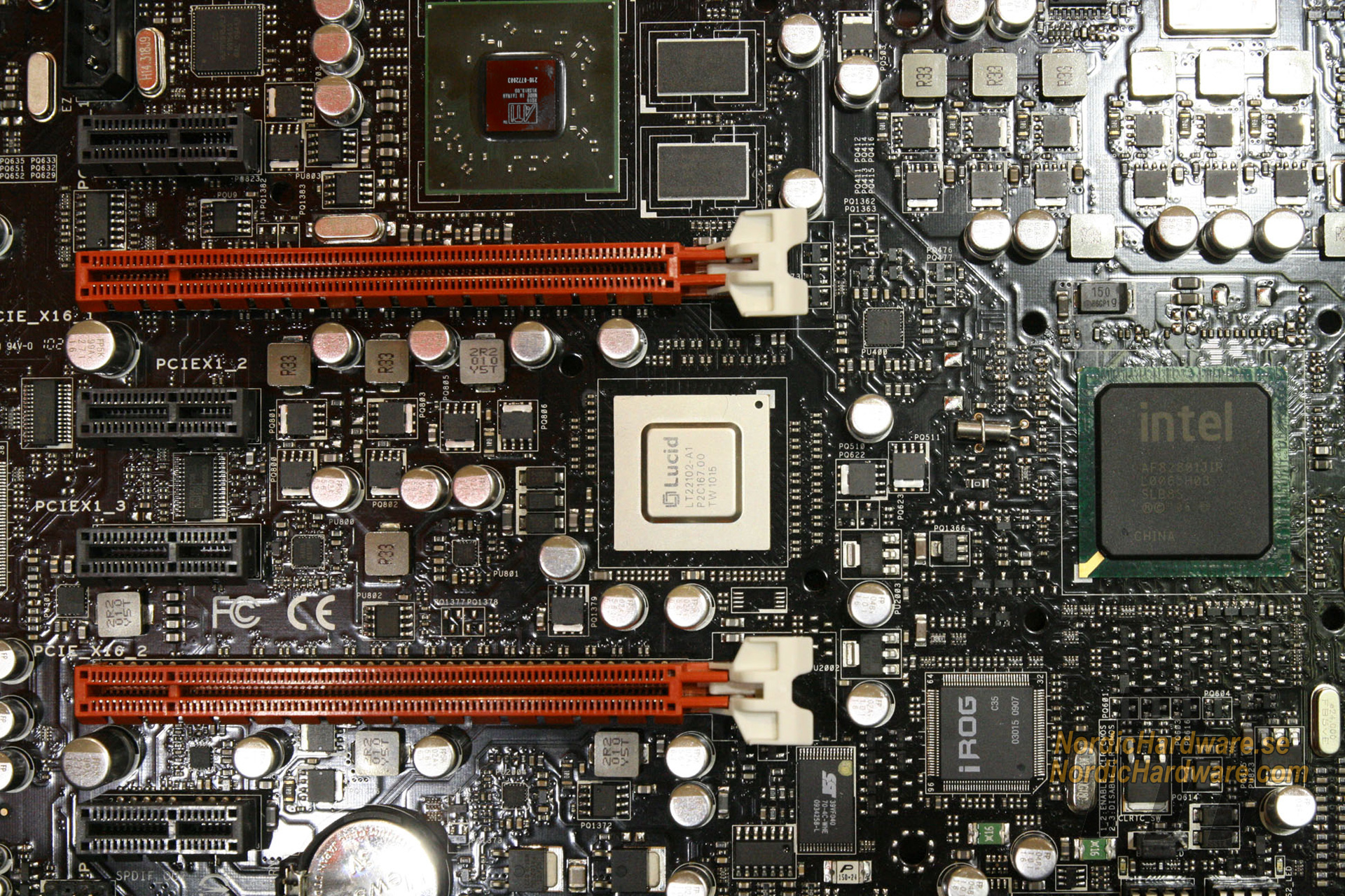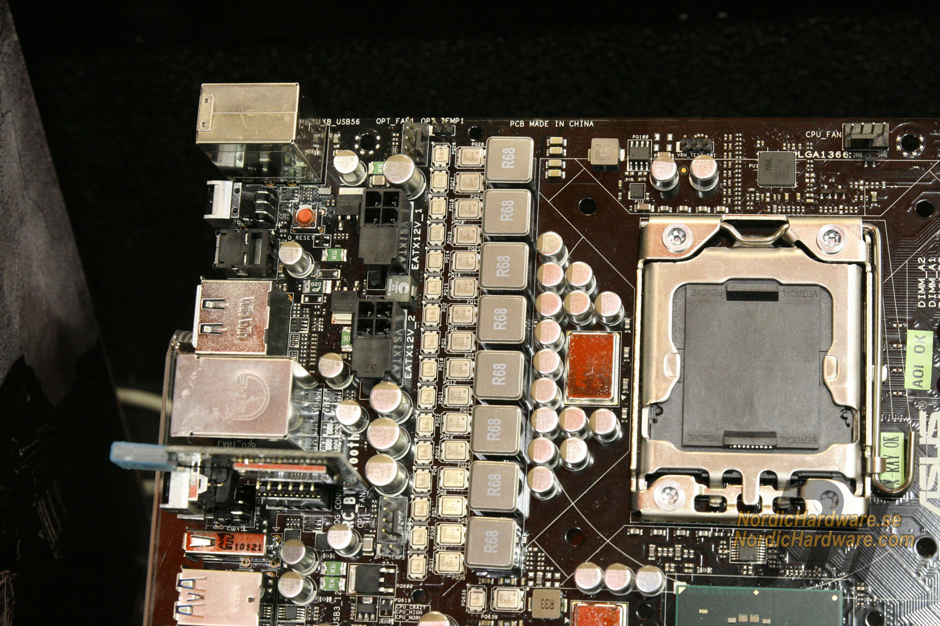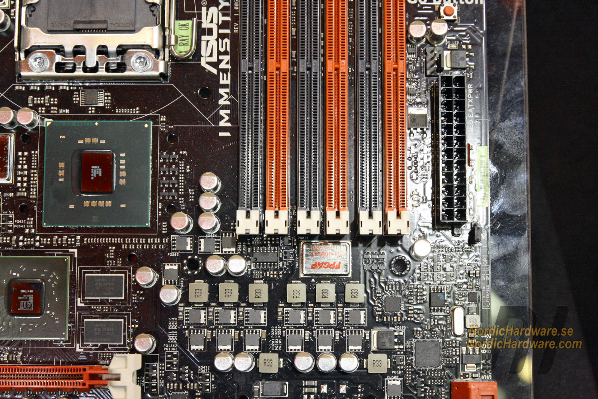 Earlier we published some pictures of the powerful heatpipe cooler, but our reporter Johan Karlsson returned to ASUS’ booth for some more pictures of the board its numerous circuits.
