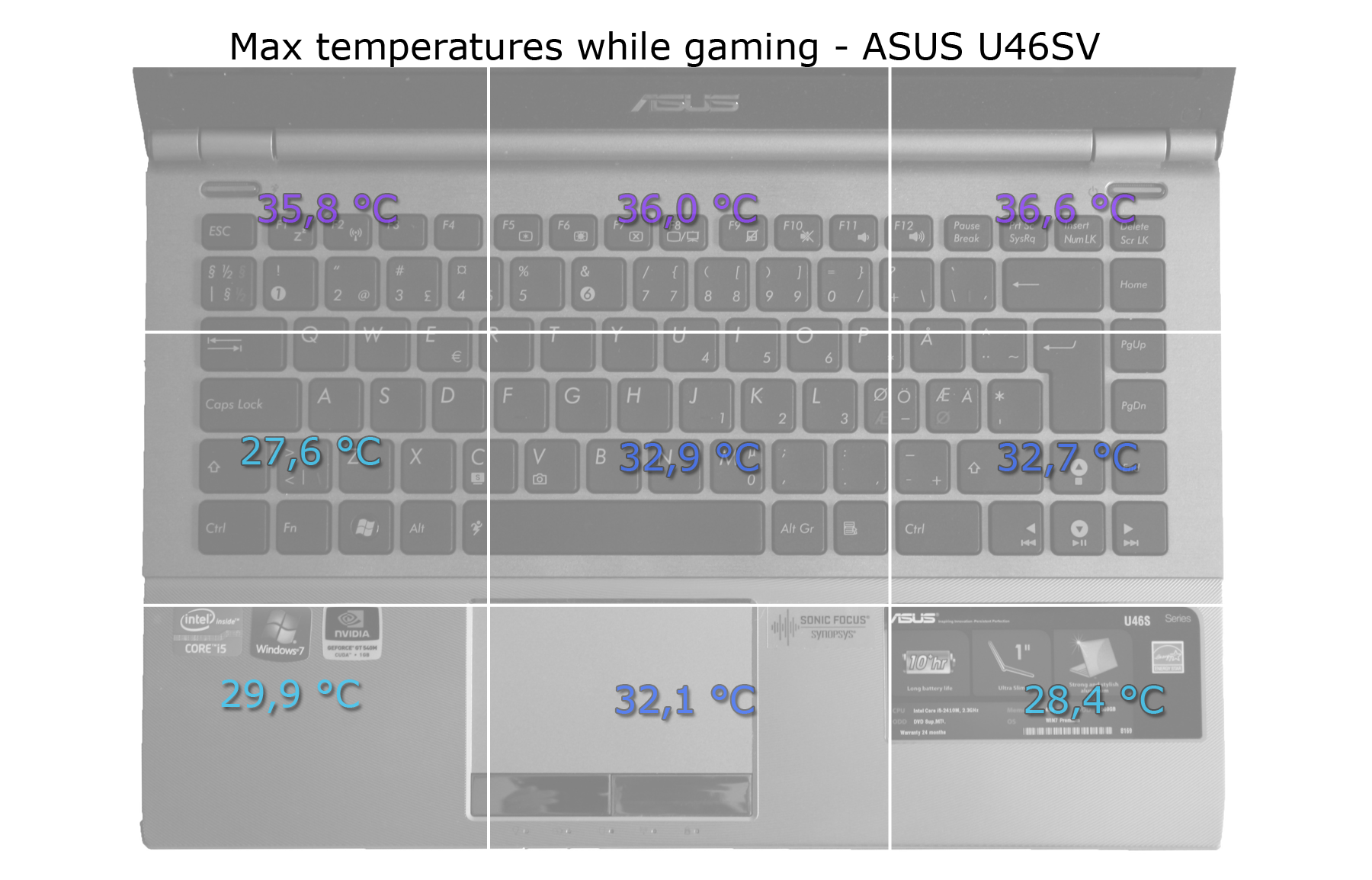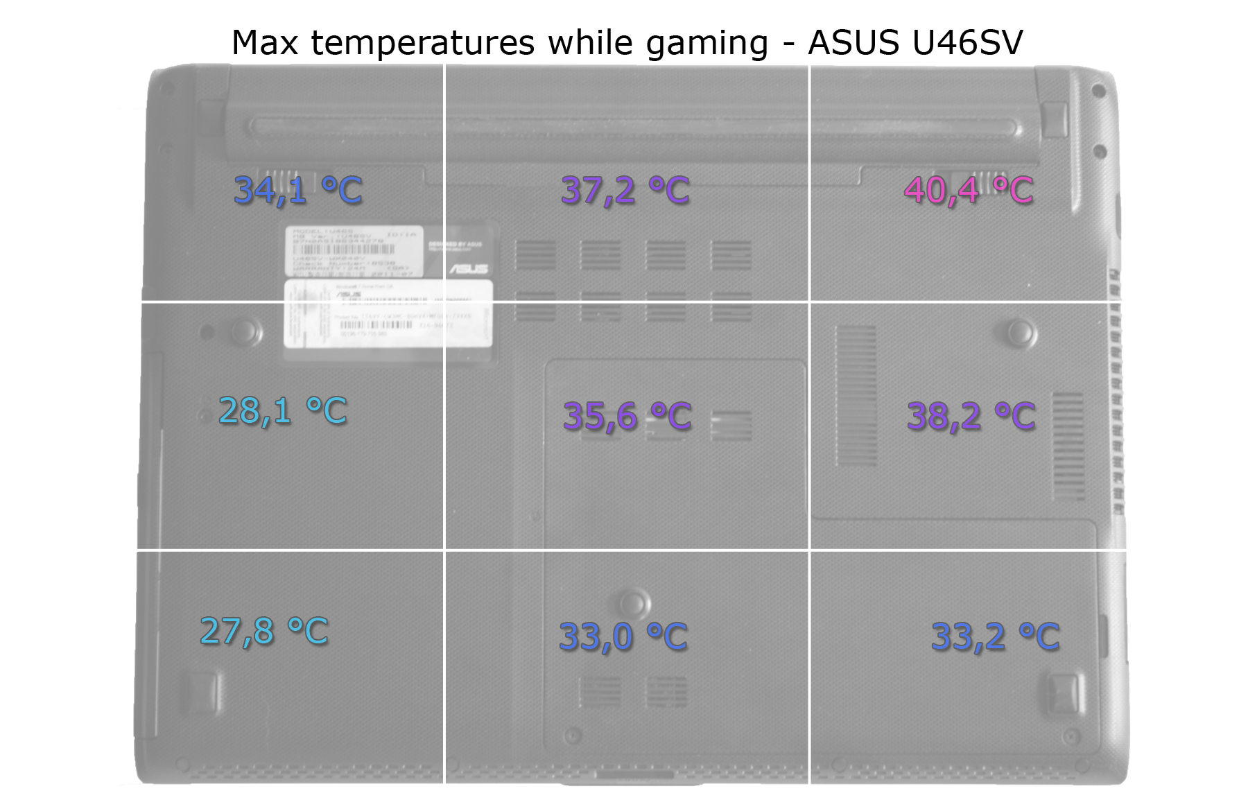 Det är andra bullar när det kommer till spel, vilket inte är helt oväntat. I vårat speltest som innefattar Crysis 2 belastas både processor och grafikkort till nära 100% konstant vilket syns på temperaturmönstret. På datorns ovansida hålls temperaturerna bra vid den mest kritiska delen som man kan tänka sig luta händerna mot. Det är i den övre delen närmare skärmen som datorn börjar bli varmare. Det är på undersidan vi ser störst skillnad där datorn på många platser börjar närma sig 40 grader, och på ett ställe faktiskt göra det.