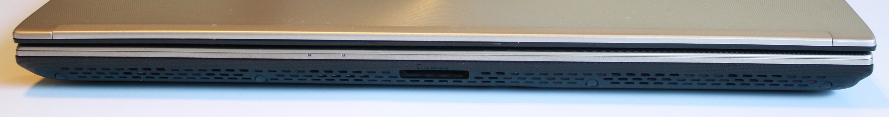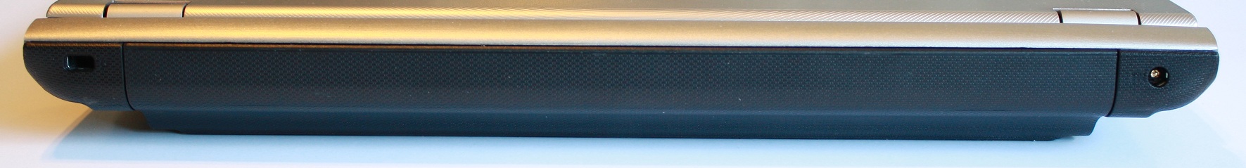 Här har ni bilder av datorns alla sidor, och på de två sista ser ni hur den är upphöjd baktill på grund av sitt större batteri. På dess framsida hittar vi kortläsaren (4-i-1), medan baksidan har en ingång för nätadapter och ett hål för att låsa fast datorn.