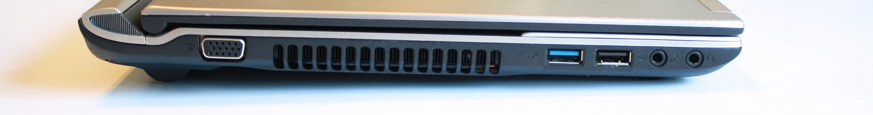 Vänstersidan bjuder på en VGA-anslutning, en USB 3.0, en USB 2.0 och två 3.5 mm ingångar för ljud-in och ljud-ut. Även datorns enda utblås finns här för dess kylning, och både ljudnivå och temperaturer ska vi ta upp i ett senare avsnitt av recensionen.