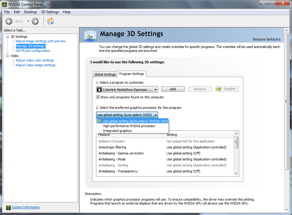 Vi tänkte ta ett kort avsnitt om NVIDIA Optimus här. Det är mycket enkelt att i drivrutinerna ställa in manuellt om vilka program som ska nyttja NVIDIA:s grafikkort, eller det integrerade från Intel. I de allra flesta fallen för drivrutinerna jobbet väldigt bra, men ibland väljer den det diskreta grafikkort även när det inte behövs. För de användare som vill optimera sin batteritid kan det vara värt att ställa in vad som ska användas till vissa program manuellt.