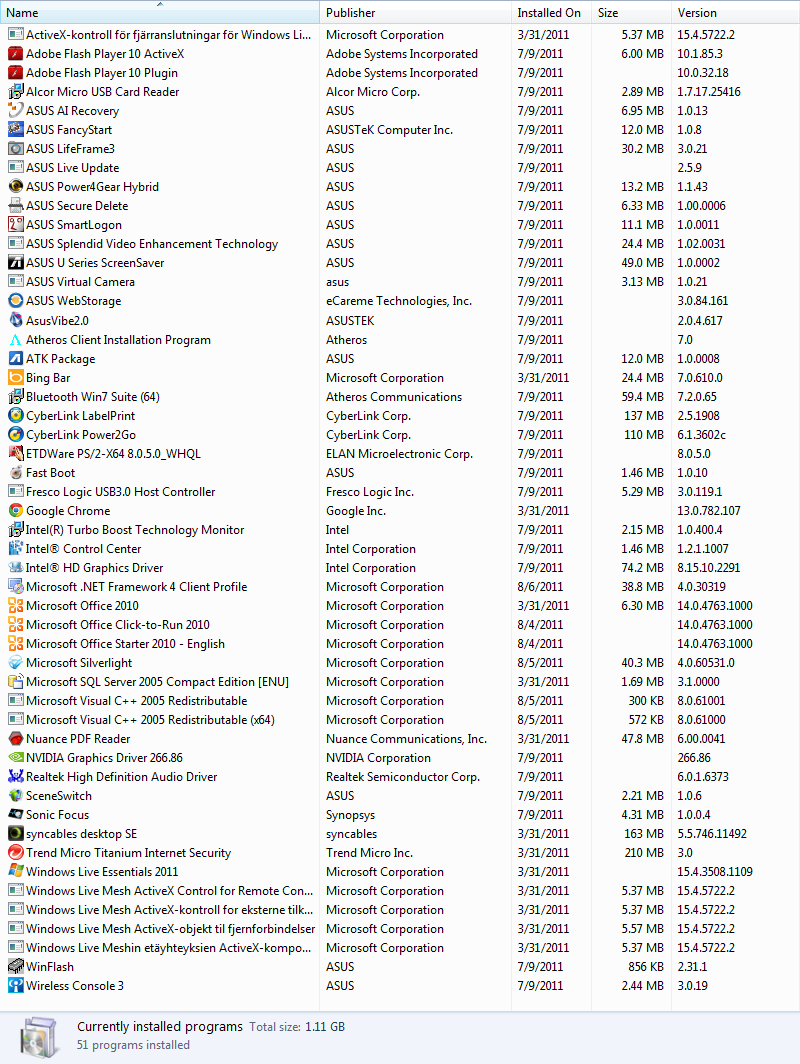 Här är samtliga program som kommer förinstallerade på datorn. Vi har faktiskt inte några större klagomål, för att vara en bärbar dator är det minimalt med bloatware Totalt tar program och drivrutiner bara upp 1,11 GB vilket är väldigt lite i jämförelse vad man kan få med förinstallerat från många andra tillverkare. Helt klart förtjänar ASUS ett stort plus i kanten för detta.