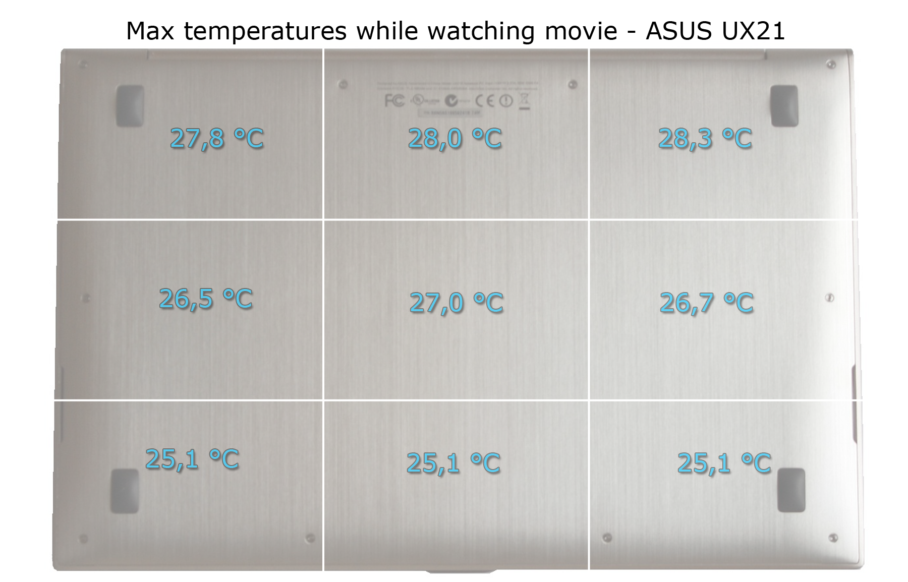 När vi slår på en film som spelas upp i 720p händer det inte alls mycket på temperaturfronten. ASUS UX21 håller sig under 30 graders strecket, och utifrån detta skulle man nästan kunna tro att den är avstängd. För att ge er en inblick i det, så känner man att datorns aluminiumchassi fortfarande är kallt.