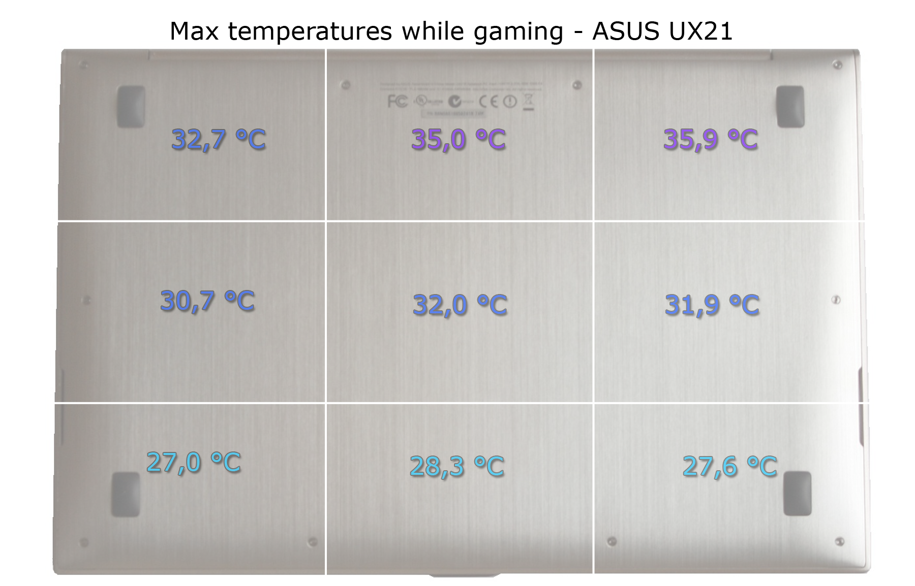 När vi sätter igång vårat speltest ökar temperaturerna överlag på hela datorn, men vi pratar inte om några stora ökningar. Det är främst uppe där moderkortet med processor och styrkrets sitter det blir varmt. Längst ned vid touchpaden på datorn finns en skillnad men den är inte påtagligt stor. ASUS UX21 blir helt enkelt inte varm oavsett vad man gör – i alla fall på utsidan.