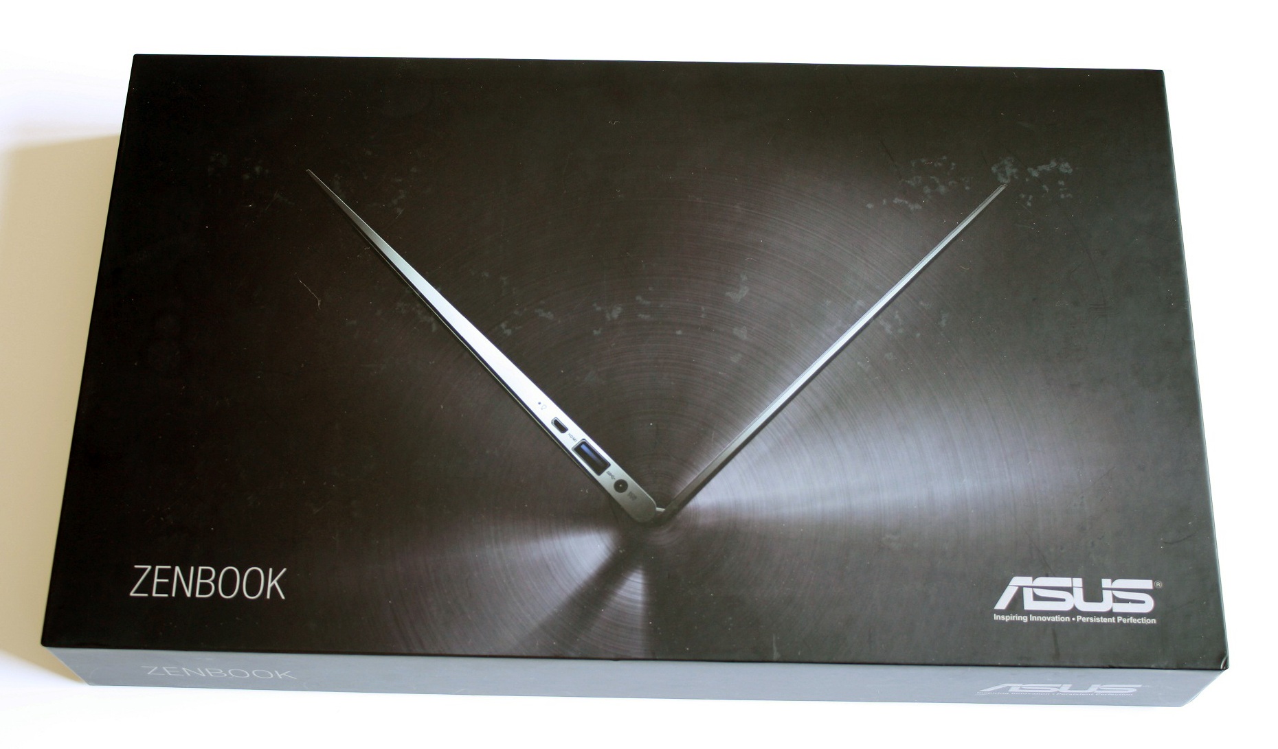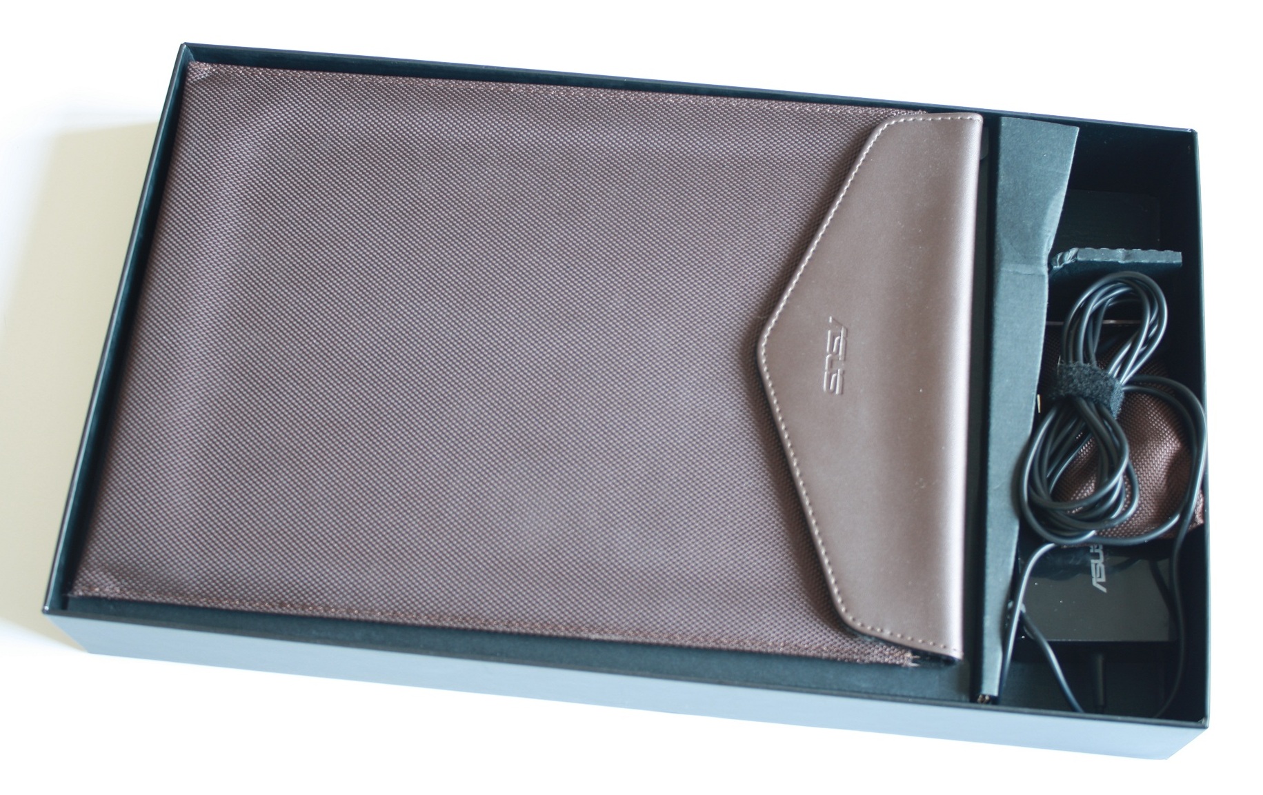 Kartongen är liten och nätt, och man undrar om det egentligen får plats en dator där i? Kartongen är svart och man ser deras UX21 pryda den i profil på framsidan, på sidan av kartongen ser vi även en liten klisterlapp där det står SandForce Driven. När vi väl har öppnat den möts vi av mer svart och en brun sleeve som ingår med datorn. Det märks att ASUS har lagt ett öga på detaljerna här, och egentligen hade det räckt med att säga att förpackningen är estetiskt tilltalande.