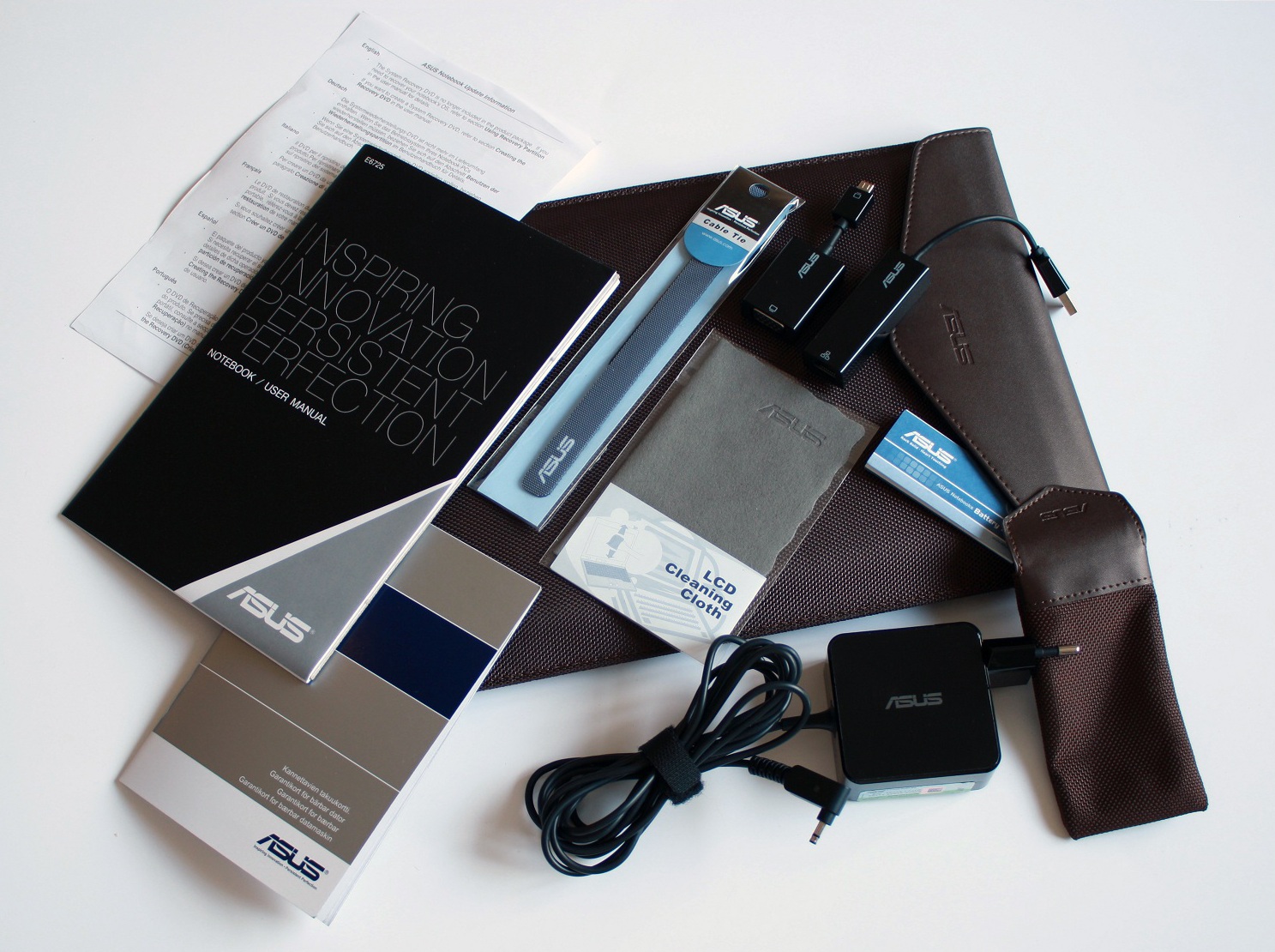 ASUS har sett till att packa med det mesta man kan tänkas behöva med datorn. Vi börjar med det obligatoriska som är laddaren – det är även där vi hittar Windows 7 Home Premium-licensen från Microsoft. Sedan har vi en manual, garantikort, fiberduk och det lilla kabelbandet vi även fick med ASUS U46SV i vår förra recension. Även lappen som säger att det inte följer med återställningsskivor men det finns en mindre partition på datorn för det avseendet.