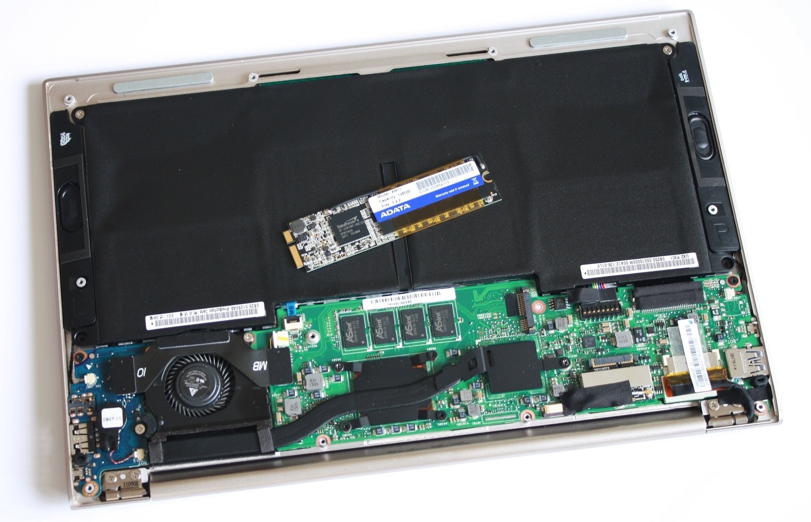 Som de hårdvarunördar vi är, vart vi imponerade över det minimalistiska moderkortet. Kylningslösningen är inte på några sätt och vis stor eller imponerande, men då den har en styrkrets på 3,4W och en processor på 17W att kyla borde den klara av att utföra sitt jobb. RAM-minnet som ligger på 4GB är fastlödat på moderkortet, och sitter faktiskt under den lilla SSD-enheten. Att ha utbytbara RAM-minnen förväntar vi oss inte från några Ultrabook i framtiden, då det tvingar tillverkarna till att använda ett tjockare chassi. SSD-enheten går att ta ut, men använder sig av ett annat gränsnitt än vi är vana vid.