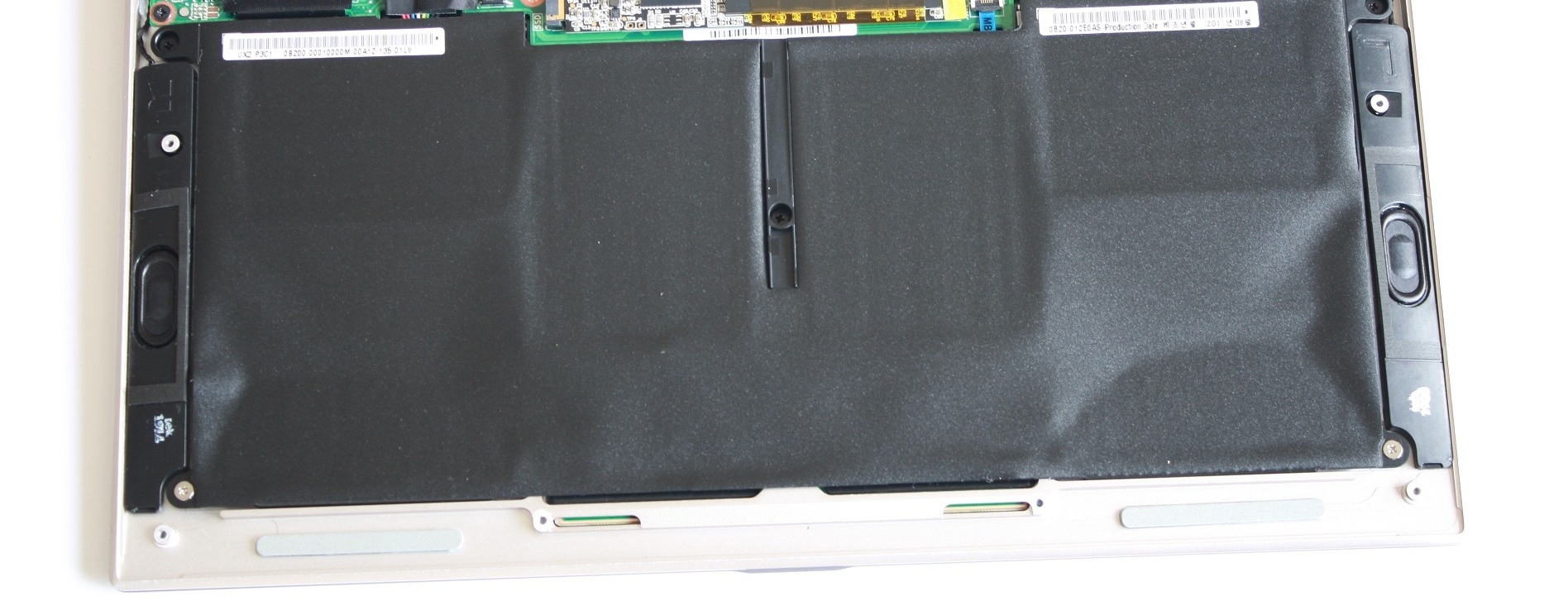 Vi ser att datorns batteri är det som ockuperar i princip hela datorn och har en kapacitet på 35 Wh, så förhoppningsvis ska det resultera i bra batteritid. Vi ser även på sidan av batteriet två svarta bitar, som ska vara högtalarna till datorn. UX21 är inte tjock så vi hade inte förväntat oss bra ljud ur högtalarna. Men vi måste ändå säga att de låg över vad man kan förvänta sig av en normal dator. Högtalarna är byggda på det sättet att ljudet inte bara ska komma ut från de två avlånga hålen som finns i botten av datorn, utan även upp genom tangentbordet.