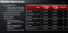 ROPs, eller Render Back-Ends, som AMD kallar dem har också optimerats och erbjuder dubbelt så hög prestanda som RV770-arkitekturen. Vilket särskilt visar sig vid användning av kantutjämning (Anti-Aliasing) där 8xMSAA numera ska ge prestandaförluster på högst 5-15%. Redan med RV770 gjorde AMD stora framsteg för sin kantutjämning men med RV870 har man gått ytterligare ett steg längre och även introducerat en ny AA-algorithm som utan prestandaförlust ger fin kantutjämning oavsett vinkel, vilket tidigare varit ett problem.