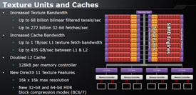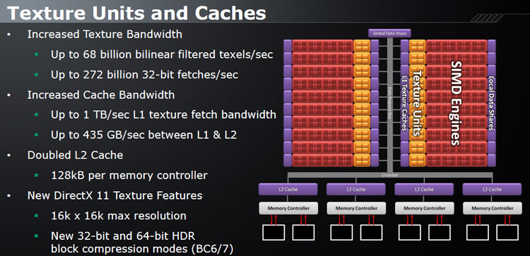 Både texturenheter och ROPs (Raster OPerations) har precis som antalet stream processorer fördubblats och tittar vi på texturenheterna (TMU) har AMD inte bara utökat deras bandbredd utan även sett över enheternas cacheminne. L1-cachen som sitter i direkt kontakt med texturenheterna når nu hastigheter på 1TB/s medan den dubbelt så stora L2-cachen på 128KB kan prata med texturenheternas L1-cache över en 435GB/s databuss. Texturenheterna stödjer även större texturer (16k x 16k upplösning) samt andra funktioner som krävs av DX11 formatet.