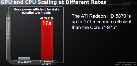 AMD är inte heller sena med att jämföra sitt Radeon HD 5870 grafikkort mot Intels flaggskepp på CPU-marknaden. Core i7-975 är den snabbaste desktopprocessorn på marknaden idag men som en generell CPU-arkitektur är man inte i närheten av RV870-arkitekturens flyttalsprestanda.