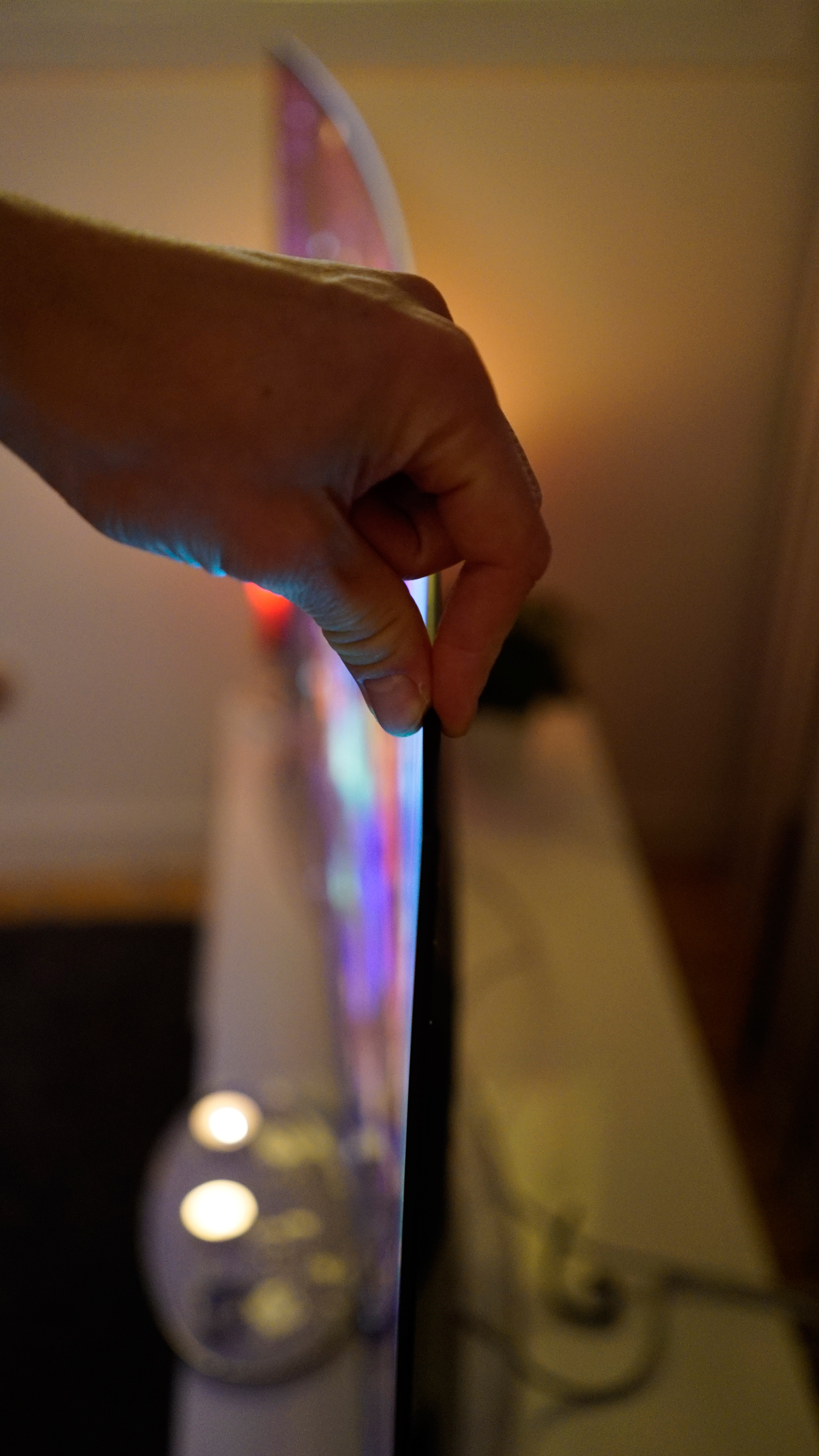 Trots att jag återigen vet vad som komma skall var det en riktigt häftig upplevelse att packa upp LG:s supertunna TV. Trots sin 5 tum större bildyta är LG 55EA980W både mindre och mycket lättare än min gamla LG-plasma på 50 tum (LG 50PK950N från 2010). Att skärmen mäter endast 4 millimeter på sin tunnaste punkt och bokstavligen svajar mellan händerna när du lyfter den känns nästan lite surrealistiskt. Den böjda panelen är en het potatis bland bildfanatiker på nätet och tills vi börjar prata närmare om bildkvalitén kan vi konstatera att det åtminstone får TV:n att se jäkligt cool ut. Supertunn och lätt böjd gör den sig även riktigt bra på TV-bänken.
